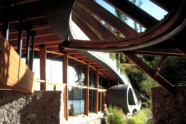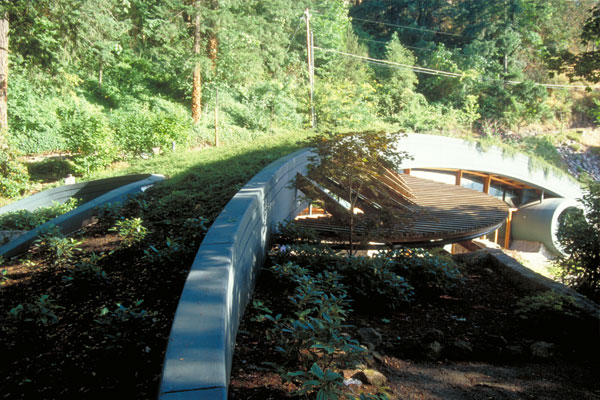 The Gibson's had an existing boathouse but felt it was a blemish on their property. They wanted to reuse the existing boat stall but build a new boathouse while adding a new studio and study. The driveway to their property is shared with neighbors. The site went from the lake up the hillside to the driveway above. Since the driveway to their property is shared with neighbors, it was decided to build the studio into the hillside. and have a sod roof so the structure would not be noticed as the neighbor drove down- the driveway. Mrs.Gibson, an artist, wanted her studio space to have high ceilings and ample natural light. Mr. Gibson, an entrepreneur, wanted a more intimate space to keep track of his business activities. The structure grows out of stonewalls that are shaded by an arching sod roof. The roof is constructed with straight Douglas fir glue laminated beams and fir decking. |
