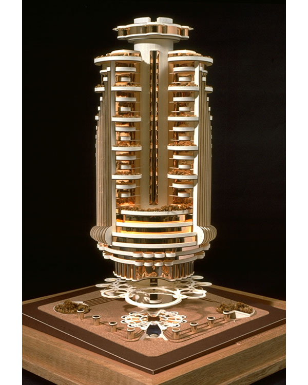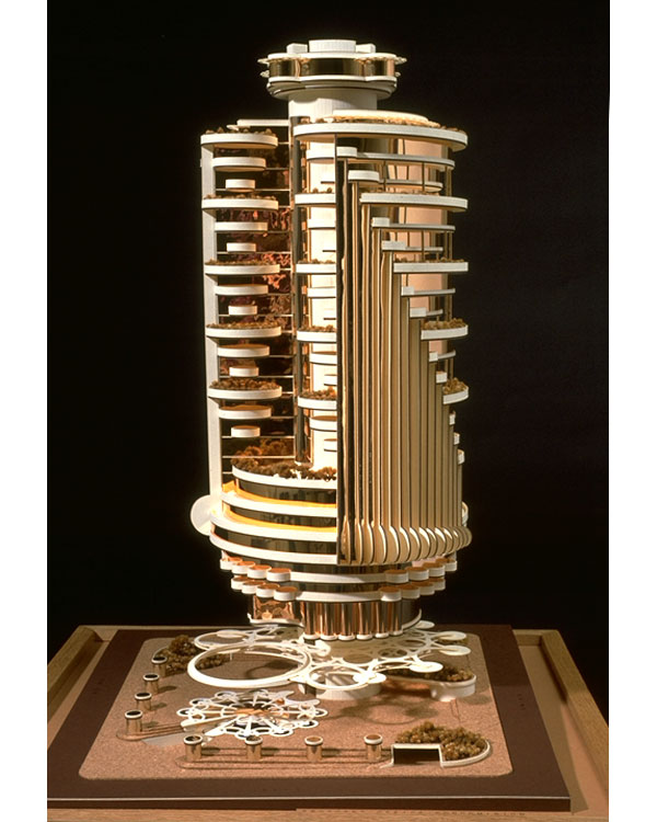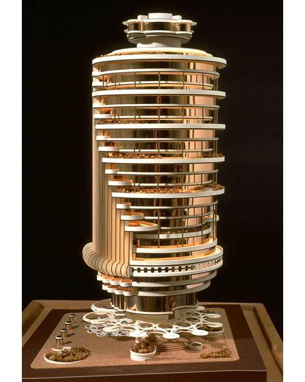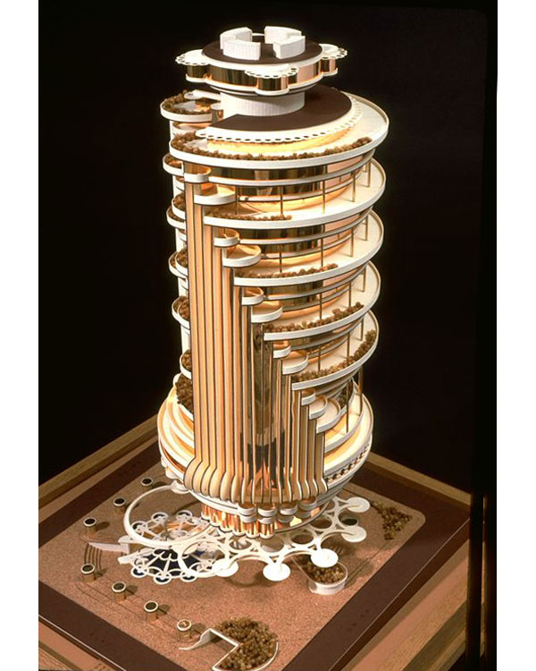 This 450,000 square foot, thirty-story mix use tower was proposed for a square block in downtown Portland. Elevated four stories above its formal entry at the upper plaza level; the tower is column free around its perimeter at ground level. Most of the street level site would have public access offering pedestrians the only public urban space in this area of the downtown core. The ground plane slopes down from the southwest corner to the northeast corner, dividing the site into three plaza levels. From the northeast, the pedestrian would be free to move gently down to the lower plaza level offering 20,000 square feet of retail space surrounding a central reflecting pool. The pool receives water in falling streams from a fountain on the middle plaza level. There would be 8,000 square feet of retail space on this level with display kiosks defining its perimeter. The plaza features a sculptured overhead trellis that cantilevers out from the core of the tower. The trellis appears to be floating out in space as it partially protected pedestrians from the elements and giving human scale to the plaza levels. The tower has a non-static design composition. The changing nature of the vertical and horizontal elements is achieved through a transitional stage where the heights of individual vertical elements step down into horizontal components. This modulating movement is related to the visual movement of the sun around the structure. Yet within all the transitional movement, there is an identity of repetitive floors in patterns of three. |