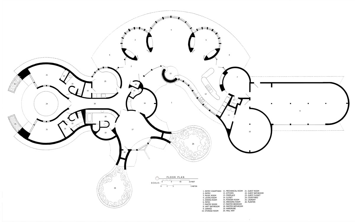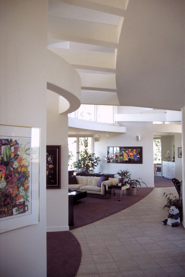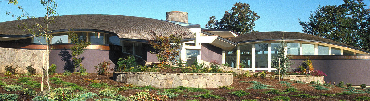 The client for this house in Oregon’s capital city was an orthopedic surgeon and his wife. Their request was for an “expressive” barrier-free home, sited to take advantage of the beautiful view of the valley below their property. Natural light was desirable for every room. The house is set along the brow of a low hill overlooking the valley. The view can be seen throughout the house. Careful planning and orientation provide each interior space with natural light from at least two directions. The clients were active in the local hospice program and wanted the ability to open their home to patients. In response to this requirement the design is on one level, and the plan is conceived as a series of interlocking circular forms for barrier-free circulation throughout the house. These interconnecting spaces create a continual sense of anticipation for each of the spaces just beyond, as one moves from room to room. The client seem quite happy with the result indicating that “this is what (they) were dreaming of, but could not explain to anyone.” |