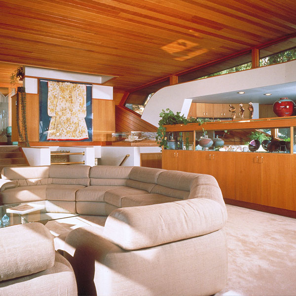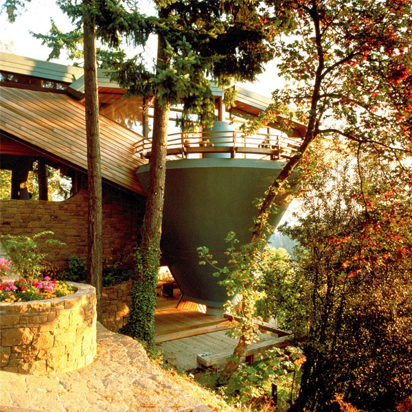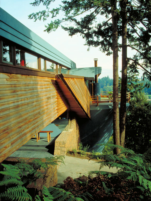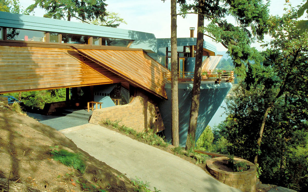 Appearing to soar right out of the hillside, this house clings to a 30-degree slope rising above the Williamette River providing a spectacular view of the river, Mt. Hood and the rising sun. The house is an experiment in feelings. Although providing a secure feeling of being anchored into the site, the structure achieves a feeling of floating in space, like a bird in flight. The structure is funnel-like in shape: starting out with a small studio on the lowest level, moving to the children’s bedrooms on the middle level, and on the upper level where the view is the best, family community spaces and master bedroom suite. |