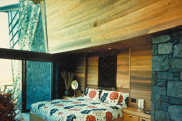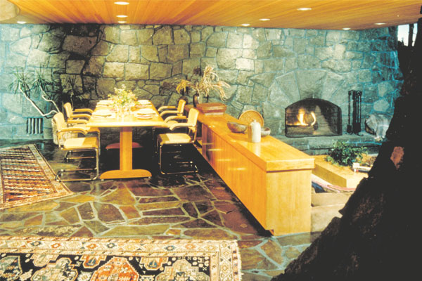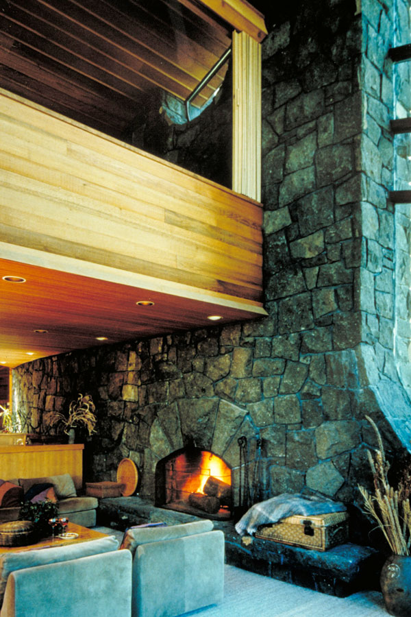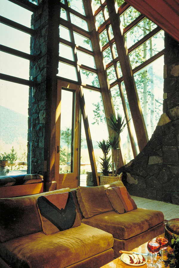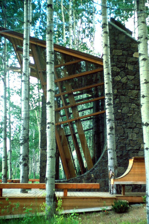 The client for this house in a resort community wanted a structure that would harmonize with the aspen grove setting and near by butte. The result is a building, which encompassed the play of colors and textures of natural materials interfaced with the surrounding environment. This is seen in the relationship of the white aspen grove against the soft curvature of the black stone and branch-like structure of the wooden elements in the glasswork. This interplay gives the building a compatibility with nature. It is an example of capturing the poetry of a site and translating its spirit into architecture; a communion between client, site and architect. |