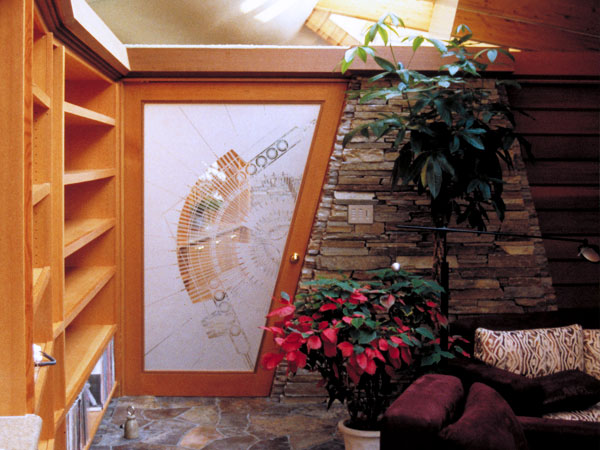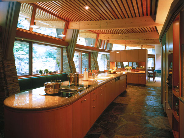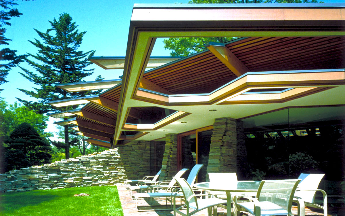 Everyone sees the house through his or her own eyes and it is irrelevant if one views it as Western or as Japanese. No matter how one interprets it, the truth of the house will shine through, moving one’s emotions by evoking a feeling of nature, comfort and beauty. It is natural in the sense that the structure is a poetic translation of its site and occupants; comfortable in the sense that it uniquely solved the occupant’s functional and spiritual living requirements and beautiful in the sense that it will continue to reveal new surprises, mystery and delight – the elements that make architecture rewarding for a lifetime. To this program, the architect brought an approach to design that honors the use of natural materials. A continuity of elements, the importance of connection of inside to outside, but above all else, an understanding of the poetic use of expressive structure as a generator of space that transcends from the physical plane to the spiritual. The architect’s efforts to bring morning sunlight into the master suite and kitchen area, afternoon sunlight into the parent’s suite, while preserving the existing landscape ultimately provided a genesis for the plan. Elevating the second story allowed for the insertion of a continuous band of clerestory glazing between it and the canopy, thereby introducing an incredible amount of natural light to penetrate throughout the interior even during the heavy snow buildup of winter. This resulted in the entire second story being held proud of the first; providing the sensation of it appearing to float above it’s base, like a bird frozen in mid-flight. |