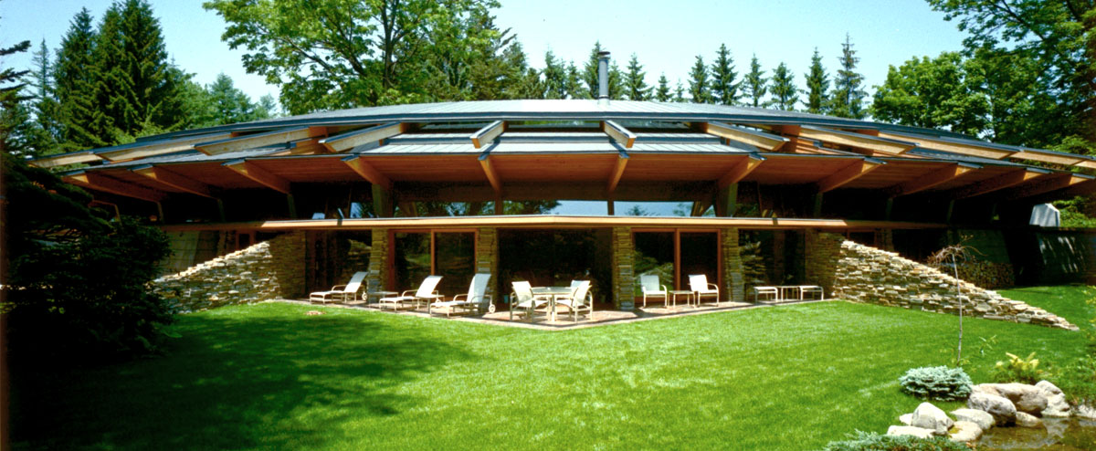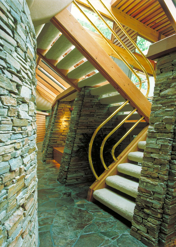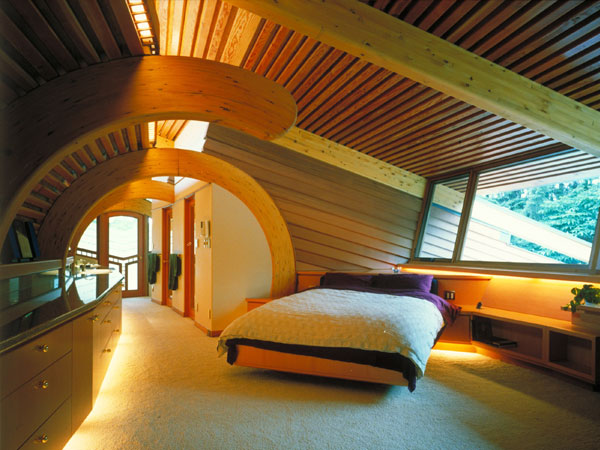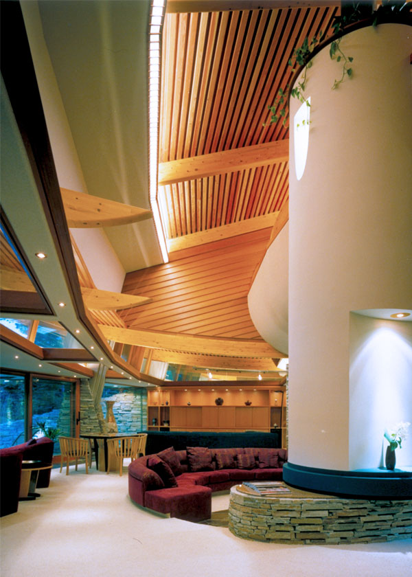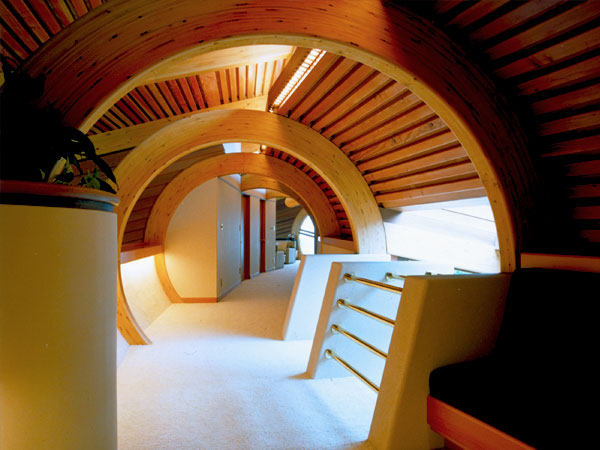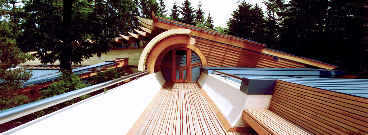 The geographical area is earthquake prone. To assist in earthquake resistance, glue-laminated beams were conceived of as curved elements; a decision that also allowed a blurring of the distinction between ceiling, wall, and floor; the result is a comforting, womb-like space for its occupants. A fusion of radial and triangular geometry, it consists of two linear wings emerging from a radial central section. A further consideration was blending the traditional Japanese needs within the design, incorporating a Japanese room with a Buddhist altar and a separate area for the Shinto shrine while also being faithful to the Japanese version of Feng Shei. The placement of the house and its curvilinear shape allowed it to weave between the existing trees on the site. Mr. Miyasaka refers to his house by saying; “this house makes me very happy, it speaks to me.” |