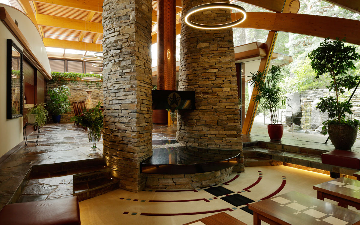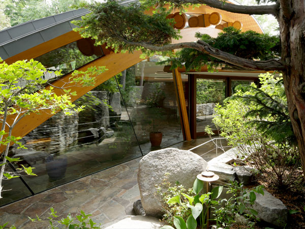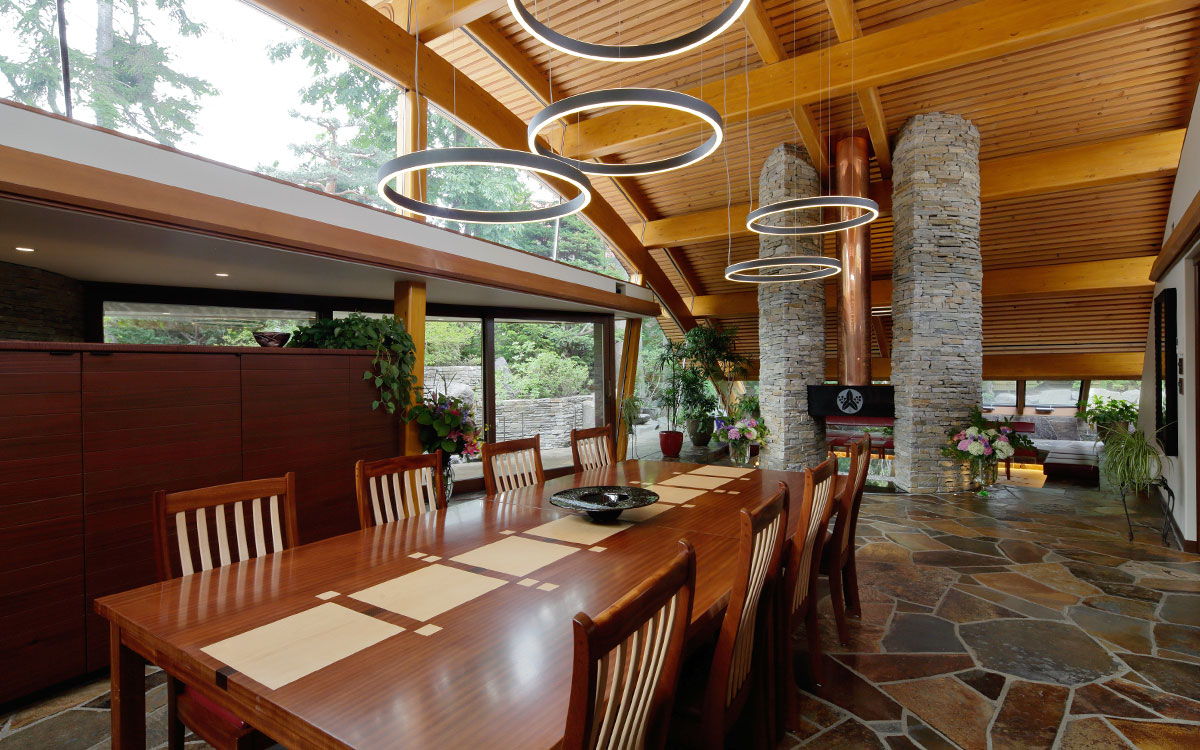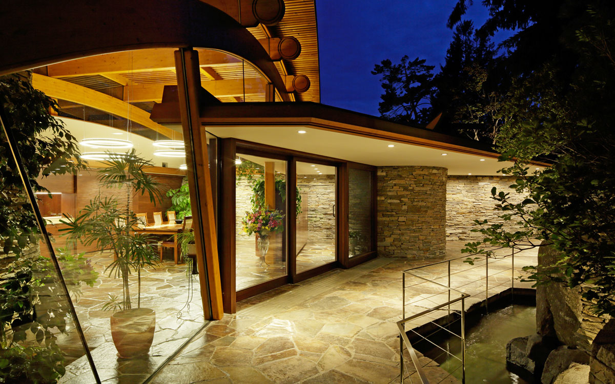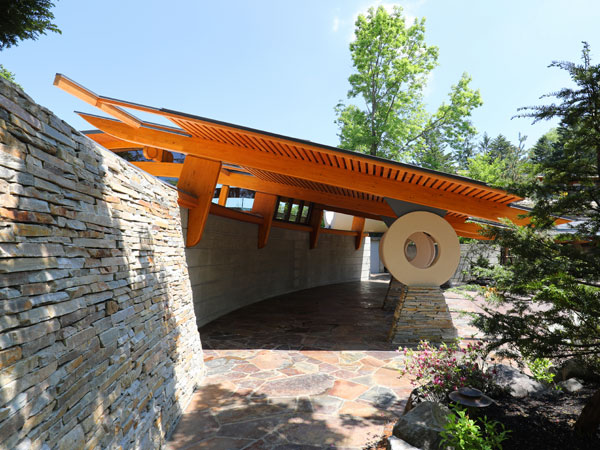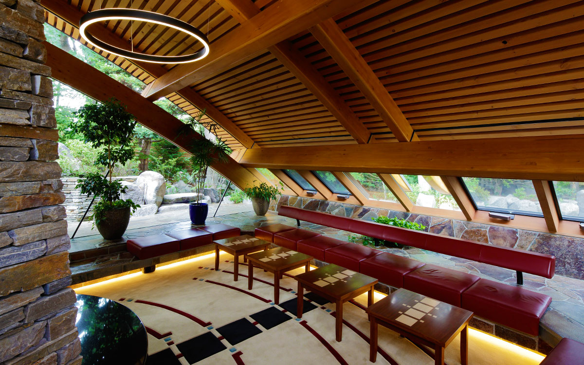 In Obihiro, Japan, Oshatz completed a 2017 addition to the Miyasaka Residence, The Miyasaka Residence was completed in 1998, and the new addition is intended as a separate pavilion for entertaining guests and includes a dedicated kitchen and a long dining room under a curved glue-lam roof. The addition fits into the radial plan of the original residence and adopts the same approach to materiality. Like the Miyasaka Residence, many components were fabricated in the United States and shipped to Japan. The curved glue-lam beams were fabricated in Portland Oregon, as was the cabinetry and custom made furniture which heatures decorative inlays that are repeated through the design. The structure provides a beautiful dining space, with rich materials and textures, while blending with the lush landscaping surrounding the house. |