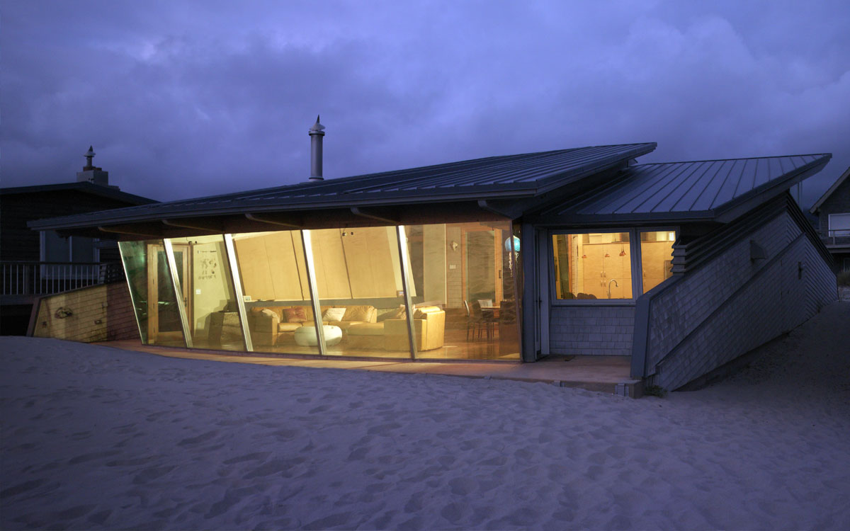 From the street, one enters through a solid gate into a courtyard; usable space for outdoor living which is protected from the ocean winds yet still boasts a full view of the sand and sea via open doors through the home. Once inside the main level of the house, one is greeted with 1700 sf of open family living and kitchen space, and floor to ceiling glass segments sloping outward toward the ocean. These arc segments of glass deflect blowing sand toward the sides of the house minimizing the buildup of sand in front of the glass. The remainder of the main level is devoted to a small master bedroom suite and 2 small guest bedrooms. Below in a 500 sf basement, lit by light wells from above, is another sleeping area, a full bathroom, and laundry room. |