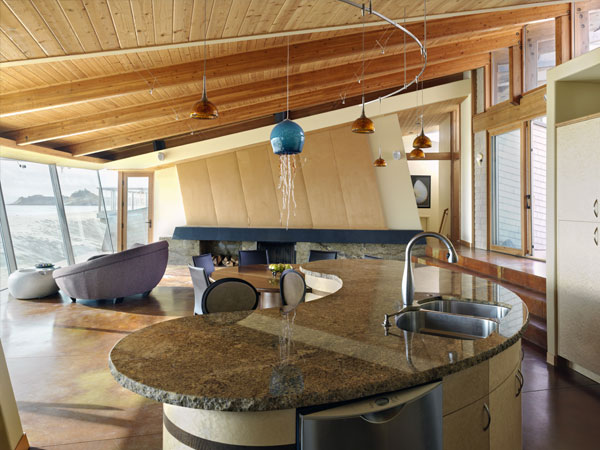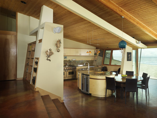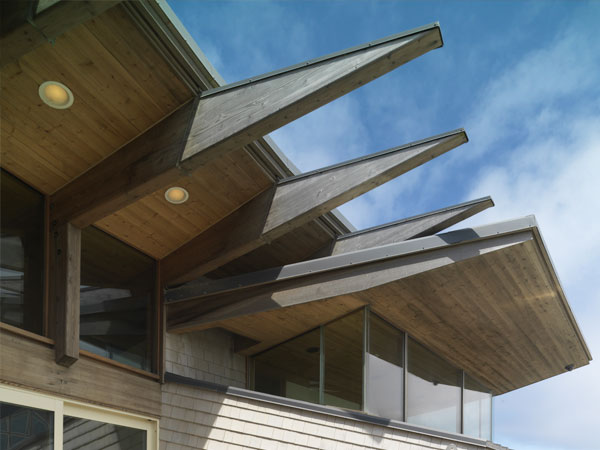 The house is on the central Oregon coast in Pacific City. The site is a tightly packed subdivision of homes sitting right on the sand. With homes 10 feet away on each side, seclusion and bringing sunlight into the structure were very important features of the design. This was mainly handled by omitting windows, except for high thin clerestory glazing, on the north and south sides of the house. Providing a large expanse of tall clerestory glazing across the front (eastside) of the house floods the interior with light yet maintains visual privacy from the street. The west side of the house is fully glazed, to take advantage of the stunning view of the ocean. In Oregon, even in summer, the western sunlight is a welcoming way to warm up the home. |