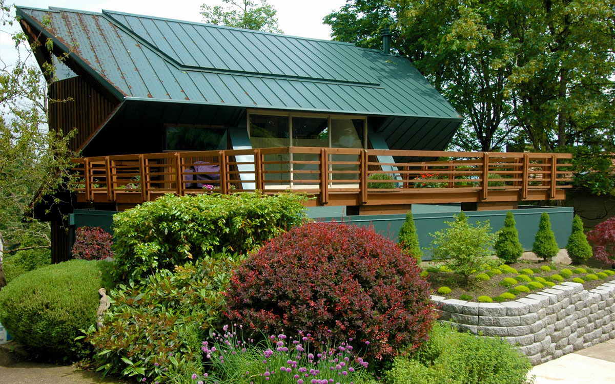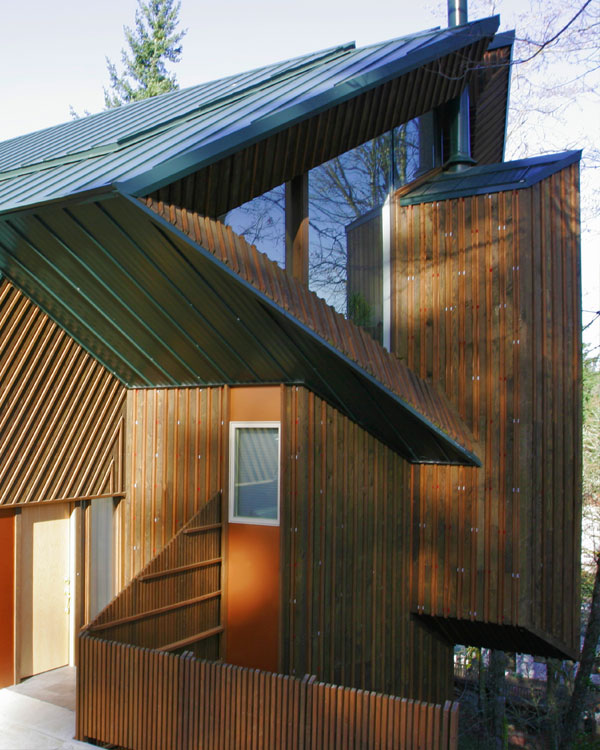 Located on a sloping site in hills of West Linn, a suburb of Portland, Oregon, the Weiss Residence provides an exclamation mark in the streetscape. It’s strikingly rigid geometric forms and unusual detailing which accentuate its shape make for an intriguing composition. While not being an example of Robert Oshatz’ most elaborate work, it may be his most admirable. Designed for Oshatz’ own daughter and her husband, the Weiss Residence was built as an affordable first home for the couple and their children. Given the restrictive budget; coupled with the steeply falling lot it is astounding that such a unique piece of architecture was achieved. The 179 square meter building is spread over three floors giving the house a vertical emphasis and making the East and West elevations somewhat tower like, yet the building is by no means menacing from the street. The entry to the home is made onto the middle level after descending a short concrete driveway, while the upper floor is almost absorbed as the eaves slope downward to form the diamond shapes that can be seen on the side elevations. The building opens out to a large rectangular deck through sliding doors. The deck is intended to act in the same was as would a traditional porch; helping to merge the lives of the home’s occupants with the rest of the neighborhood, this helps to soften the building from the street. The deck also is used to roof the garage and reduces the scale of the building by extending out toward the sidewalk. At its farthest extremity from the house the deck sits less than two meters above the sidewalk. The facade is further broken down by the planter box, adorned with small shrubs which help to reduce the scale of the building. |