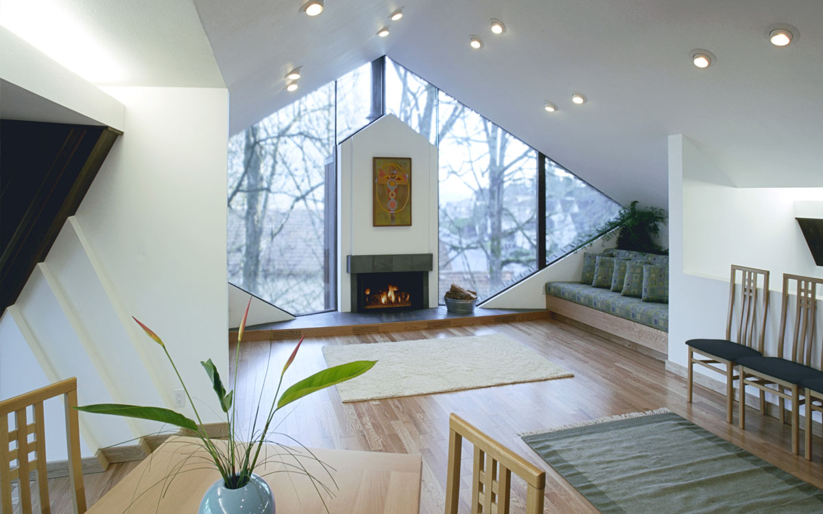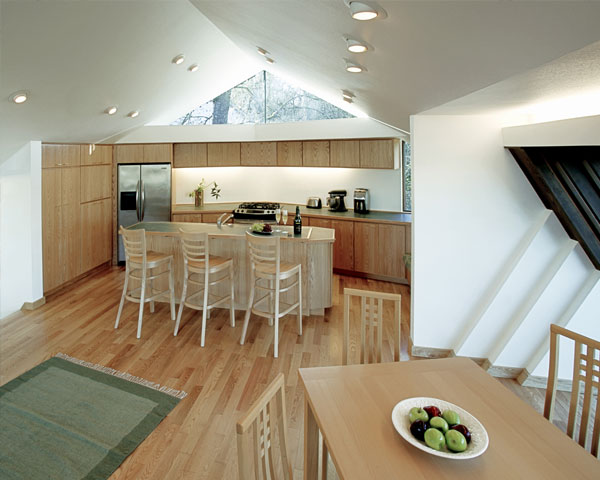 The upper floor sits beneath a raking ceiling that follows the slope of the roof, and is punctuated with an arrangement of swiveling down lights. The diamond form seen on the exterior is carried through the space by means of the raked ceilings, and white scalloped details which grow out of the floor and collide with the exterior cladding which is brought through the openings perpendicular to the room’s main axis. The fireplace provides the room’s main emphasis. Standing freely amongst an expansive glass window the fireplace is finished in the same white as the rest of the room yet is isolated by glass and oak floor boards. It respectfully reflects the angle of the ceiling but ultimately remains a distinct element in its own right. At the opposite end of the room a neat kitchen is lit by a clerestory window which takes up the diamond form. The middle of the room is broken by a sliding door that opens out to a cantilevered deck which soars out amongst the tree tops giving a magical view of the Oregon landscape. The Weiss Residence is an inspiring example of design in its own right, especially given the physical restraints of a sloping block, but the fact that it was built as an affordable home makes it even more astounding. The innovative building systems that were chosen for economy are in fact turned into architectural assets. The cladding and roofing combine to emphasis the form of the building, while the interior details bring the whole building together into one unified composition. Robert Oshatz has in this house addressed a difficult brief in such an inventive way that the Weiss Residence feels nothing like affordable housing. It feels like what it is; a skillful and well considered piece of architectural design. |