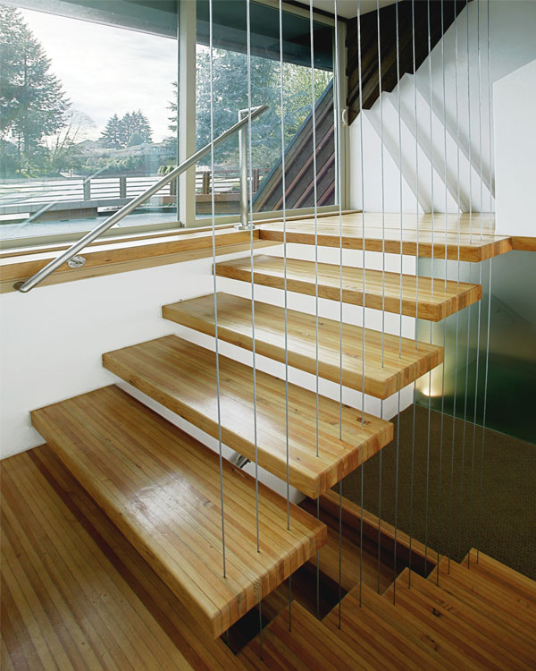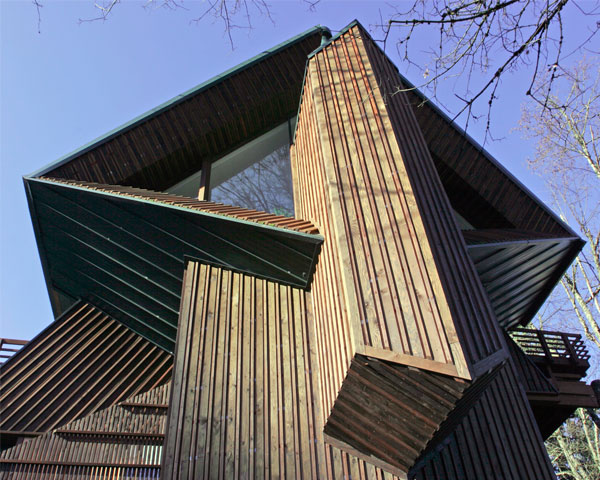 The skin of the house is constructed from outdoor treated lumber, chosen for economy, yet in its utilization provides a beautiful addition to the design. The strips of wood, used with alternating profiles are combined to form a striped elevation that helps to emphasize the forms of the structure. This is used to great success in the articulation of the diamond shape that is formed by the splitting of the eaves from the roofline. The stripes which run vertically up the building and emphasize its tower like form, are then sloped, perpendicular to the edges of the diamond, turned again, and carried through horizontally to the glazing. The fireplace, which seems to grow out of the Eastern elevation, is also accentuated by the striping effect. The metal roofing, which was also chosen for economy is also used to add to the texture of the elevation. When used in conjunction with the wood cladding system the straight folds of the metal roof help to enhance the geometric forms of the structure. The interior of the house is equally as interesting as its exterior. The lower and upper floors are accessed via a stair case with treads cantilevered out from the wall. The stairs are suspended at their extremities by stainless steel cables that run the full height of the three story stair well. They create a vertical emphasis similar to that achieved by the exterior cladding, while the cantilever is reminiscent of the two decks that project out amongst the trees from the lower and upper floors The lower floor is home to an entertainment room, with a bathroom and the cantilevered deck, accessed via sliding glass doors, while the middle floor contains three bedrooms which each exhibit interesting formations in plan that are in turn expressed through the exterior. These two levels are executed with the same precision as could be expected from a skillful architect, but it is the upper floor that provides the most dynamic space in the house |