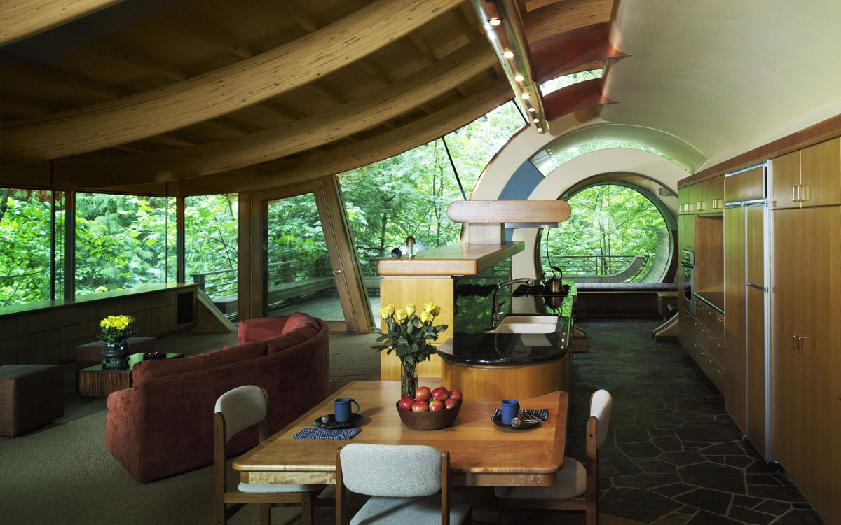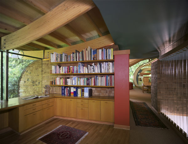 The Wilkinson House by Robert Oshatz, completed in 2004, is an example of modern architecture at peace with its site. The house occupies a wooded Pacific Northwest site, with a fast sloping grade that allows the main level of the house to sit amongst the tree canopy. Walls made of glass let abundant natural lighting through into the interior spaces and provide views to the surrounding canopy. The openness created by the glass walls satisfying the resident’s desire to see and hear the surrounding bird life and let the home feel like a part of the surrounding landscape. |