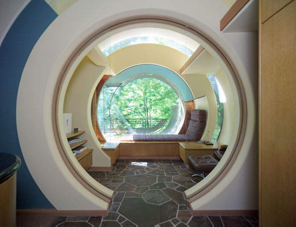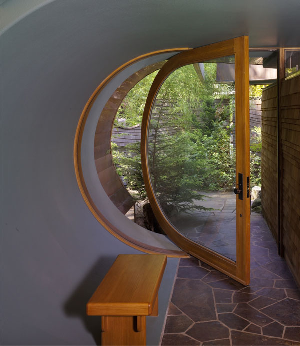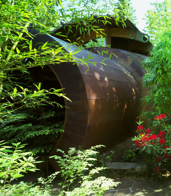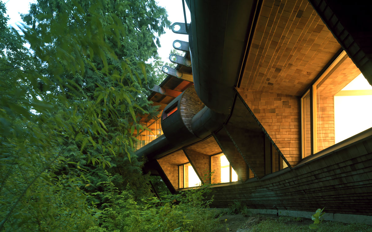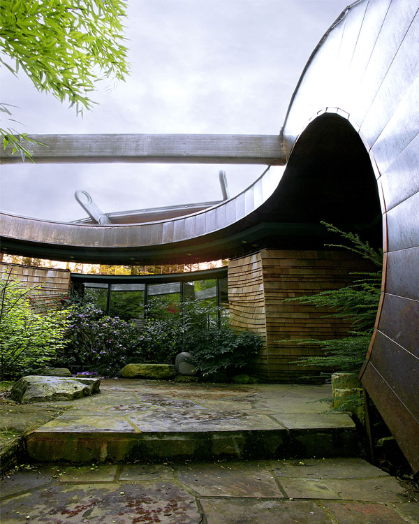 Oshatz left no detail untouched; he provided for natural ventilation, and environmentally friendly gas-fired hot water radiant floor heating. As the resident is a lover of music, Oshatz carefully controlled the acoustics of the interior space, and designed the volumes of the house to resonate with the flow of music. The exterior of the house consists of a series of horizontal layers featuring copper, cedar shingles, and a copper metal roof. The entrance walkway passes through a small Japanese garden. |