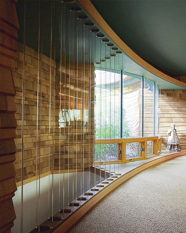 Natural materials provide a variety of colors and textures to create a warm interior environment. Materials used include cedar shingles, wood trim, gypsum board, carpet, slate tile, granite tile, and copper. The space of the house seems to flow effortlessly between inside and out by continuing the materials of the interior through the glass walls and out to the exterior. Curves add tranquility to the home; a series of curved, glue laminated beams support the high ceiling overhead, cedar shingles describe a series of organic curves, and a glass enclosed meditation room adjacent to the main space is a circle in section. |